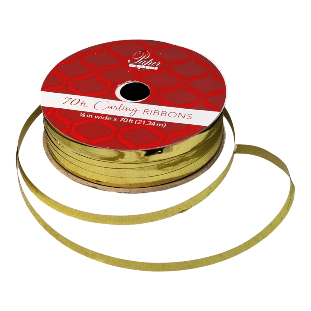 Browse the Complete Gifts & Holiday Collection Enhance the sparkle of your celebrations with our luxurious 70-foot Curling Ribbon! Bathed in a gleaming gold hue, this ribbon adds a touch of opulence to any gift or decor. Perfect for the holidays, birthdays, or any occasion that calls for a little extra glamour, this curling ribbon transforms ordinary packages into dazzling displays. Its ⅛-inch width makes it ideal for crafting intricate bows and effortlessly curly flourishes.