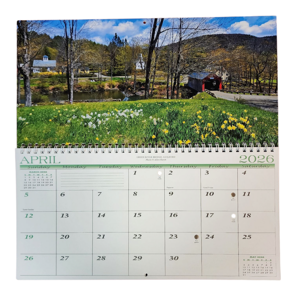 - Each month features a captivating photo of Vermont's famous covered bridges
