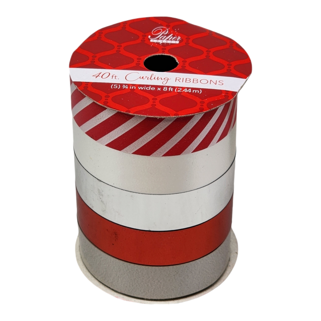 Add a festive touch to your gift-wrapping and crafting projects with this versatile set of Curling Ribbons! This lively assortment features five distinctive designs including vibrant red elegant white shimmering silver and a playful red and white striped pattern. Each roll offers 8 feet of ribbon providing a total of 40 feet of decorative potential all at ¾ inch wide.