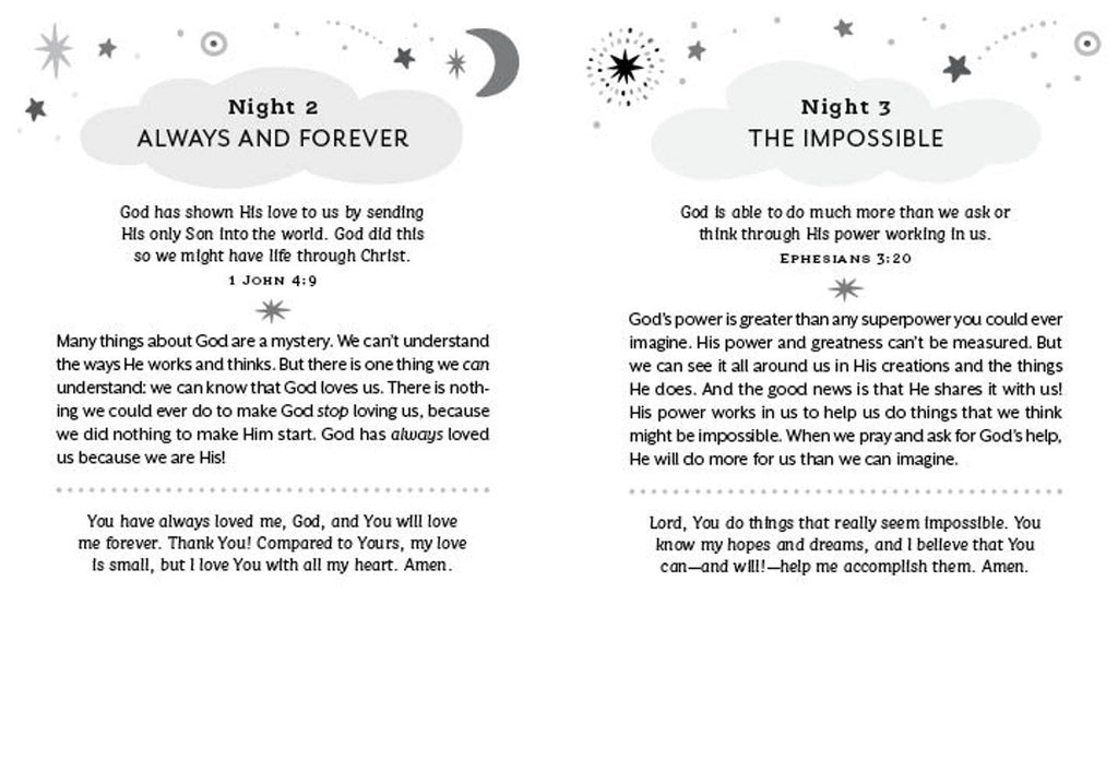 In just 3 easy steps—1) meditate on a brief, but powerful, scripture selection; 2) read through a relevant devotion; 3) start a conversation with God by reading a heartfelt prayer—boys will be encouraged and motivated to grow in their faith. Bedtime will become peaceful and comforting—the very best time of the day!—with these truth-filled devotions and prayers!