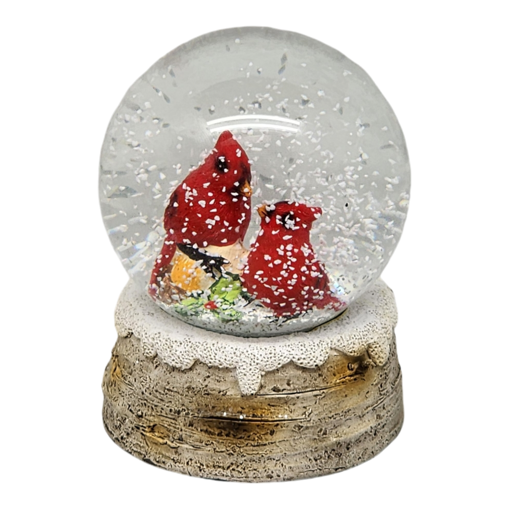 4 Inch tall waterglobe has a pair of bright and festive Cardinals perched inside.