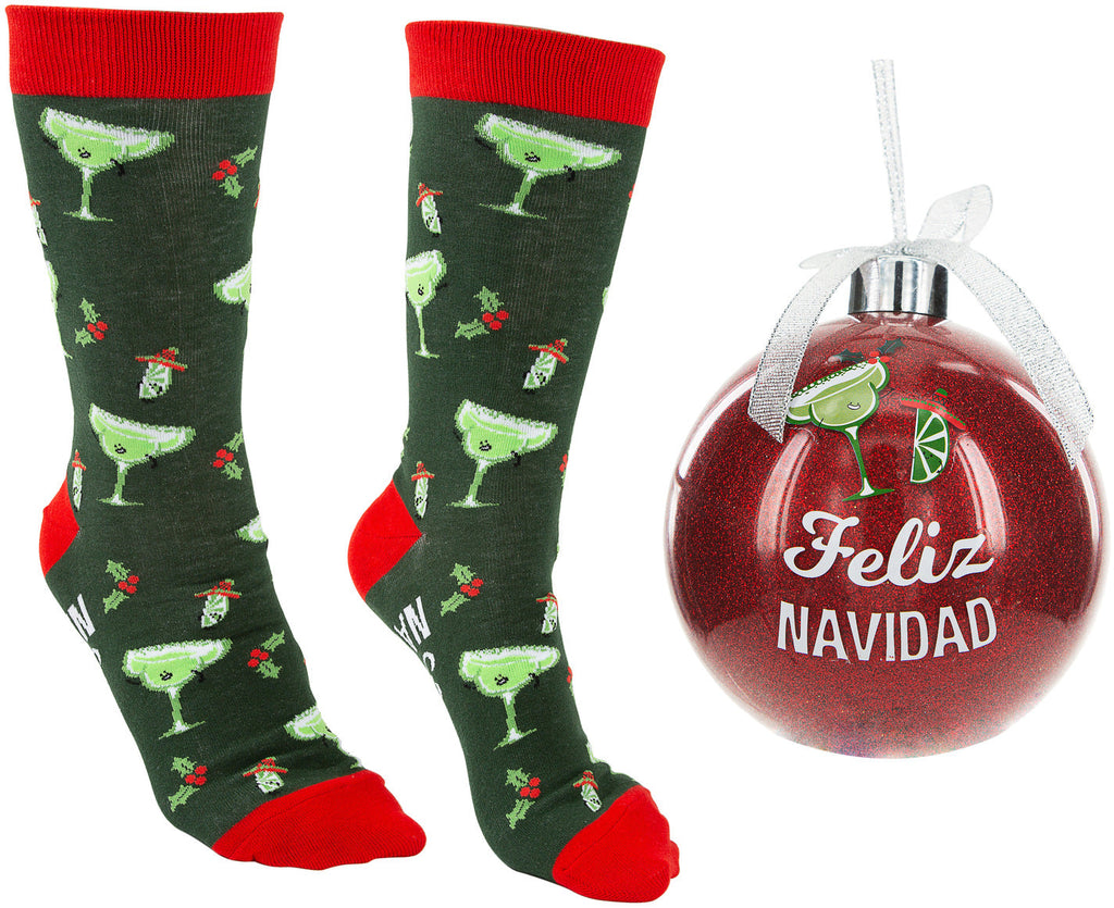 Adorable plastic ornament contains a full size pair of super cozy socks. 4" ornament with unisex socks packaged in a clear acetate box with hangtag is made from plastic. Socks are made from a high-quality cotton polyester and Spandex blend that allows for stretching.