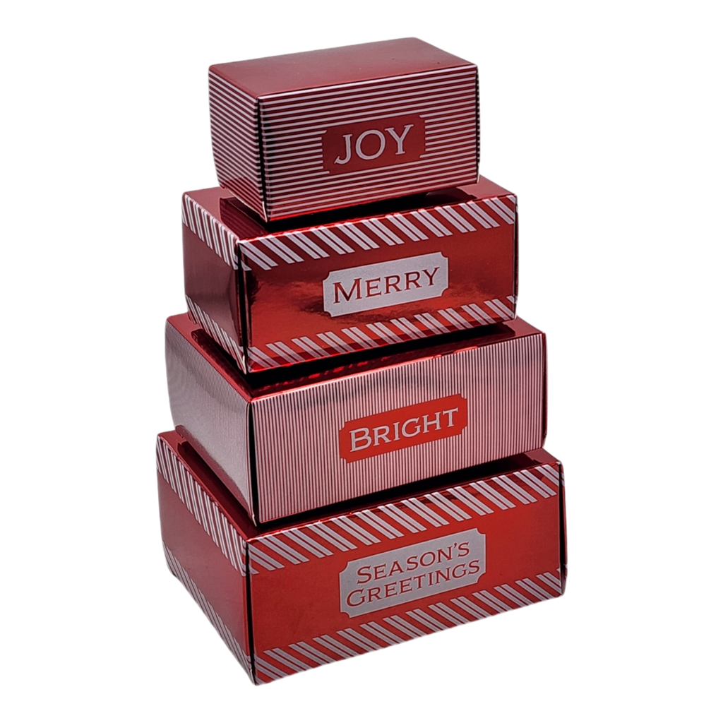 Browse the Complete Gifts & Holiday Collection Celebrate the season with a delightful touch of elegance using our 4 Piece Treat Tower Interlocking Gift Boxes! Perfect for making your holiday gifts stand out, this stack features four beautifully designed boxes that interlock to create a stunning tower of festive cheer. Each box is gleaming in bright red with charming seasonal greetings like "Joy," "Merry," "Bright," and "Season's Greetings," adding a cheerful message for all to enjoy.