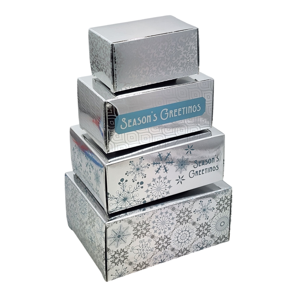 The set includes four different sizes, from the petite 3.25-inch box to the generously sized 5.25-inch box, allowing you to mix and match your gift items while maintaining a stunning, unified appearance. There's no need for extra wrapping paper; these gleaming boxes are ready to shine under the Christmas tree or as a standout centerpiece. Inspired by timeless holiday traditions, this treat tower is a delightful way to spread joy and show your loved ones how much you care. Elevate your holiday gifting with these exquisite stacking gift boxes and make each present a moment to remember!