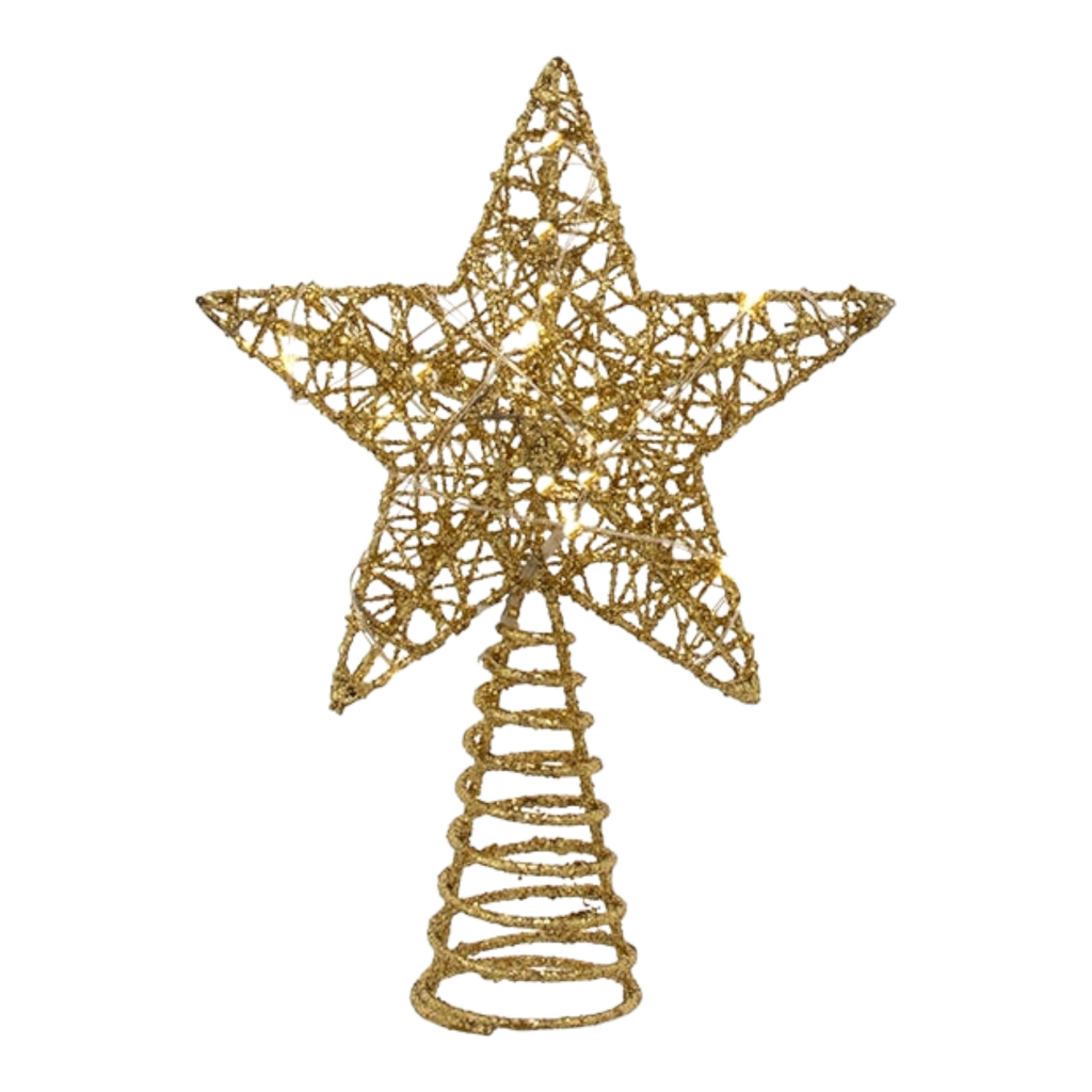 Illuminate your holiday tree with this dazzling 6-inch battery-operated lighted gold tree topper. Featuring an intricate wire design, this star shimmers brilliantly, casting a warm glow that elevates any Christmas decor. Its intricate pattern and elegant gold finish make it a standout piece, adding a touch of sophistication and sparkle.