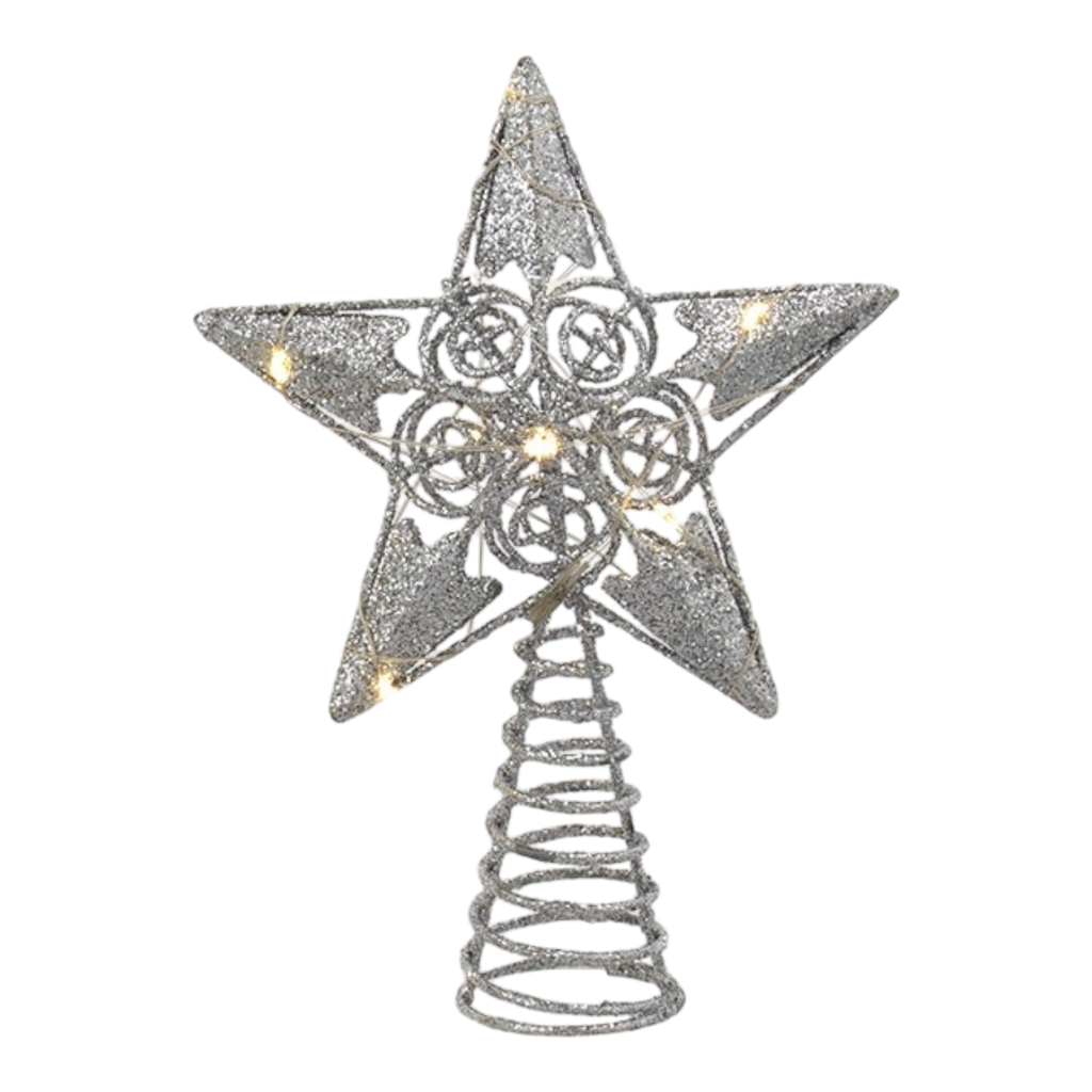 Designed for indoor use and powered by batteries, this topper is both beautiful and practical. Its silver finish complements any theme, adding a modern yet timeless charm. Elevate your festive display with this stunning piece that embodies the spirit of the season.