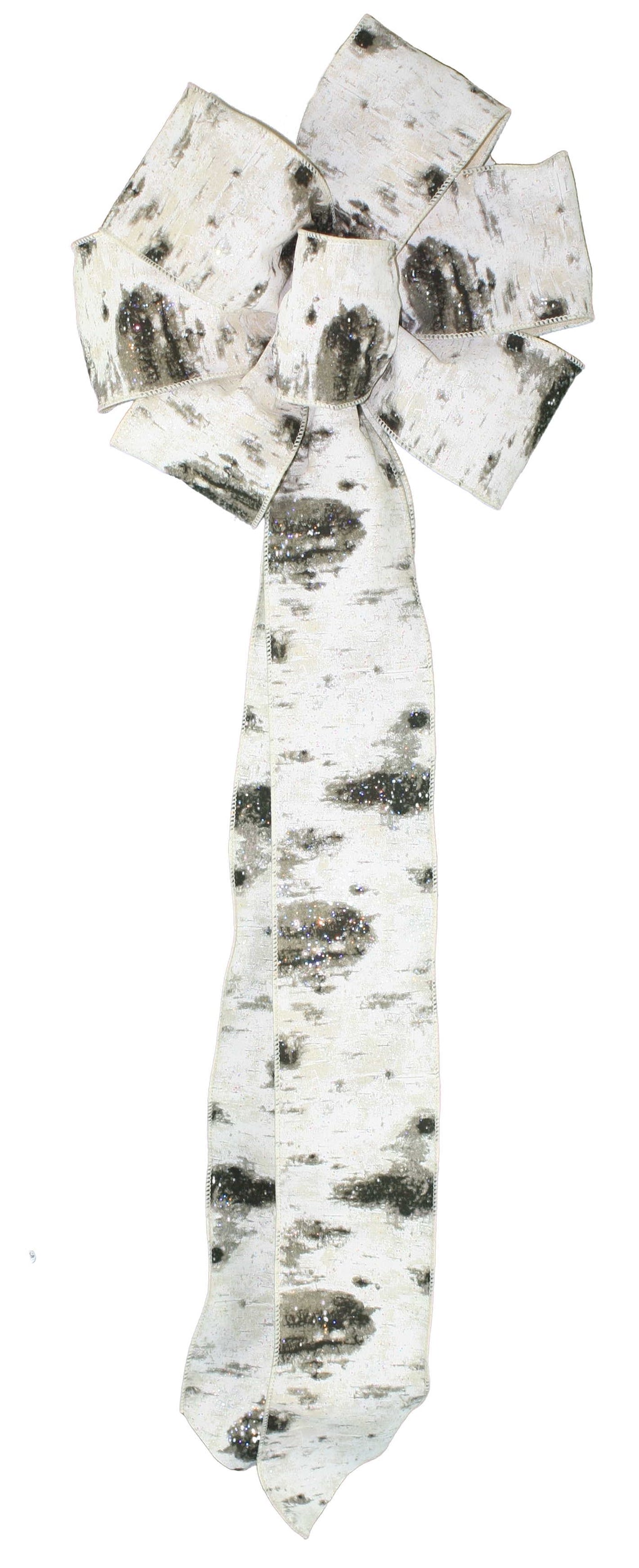 6 Loop Bow with Tails made with a wired ribbon with a White Birch Base pattern accented with Glittered accents.