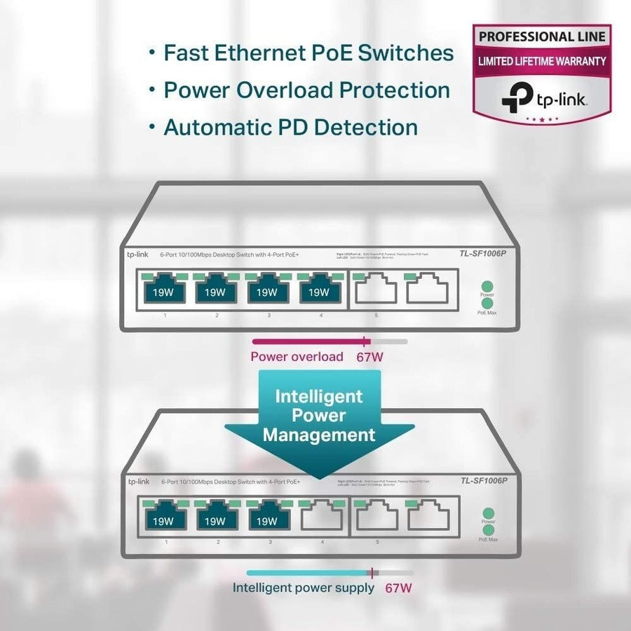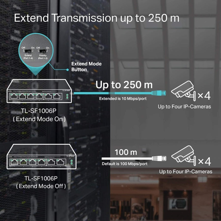 The TP-Link TL-SF1006P is a 6-Port 10/100Mbps Desktop Switch designed for small businesses and surveillance networks. It features 4 PoE+ ports, offering seamless power and data delivery on a single cable, making it ideal for devices such as IP cameras and access points. This desktop switch is perfect for those requiring a straightforward network expansion with plug-and-play capability.
