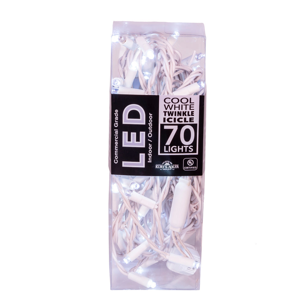 Add to your holiday décor with this 70 light cool white soft twinkle LED icicle light set from Kurt Adler. Each light set includes a 6, 5, 3 sequence for a total of 15 icicle drops and is packaged in an acetate box. This light set offers a variety of uses and would be a terrific addition to any holiday lighting décor.