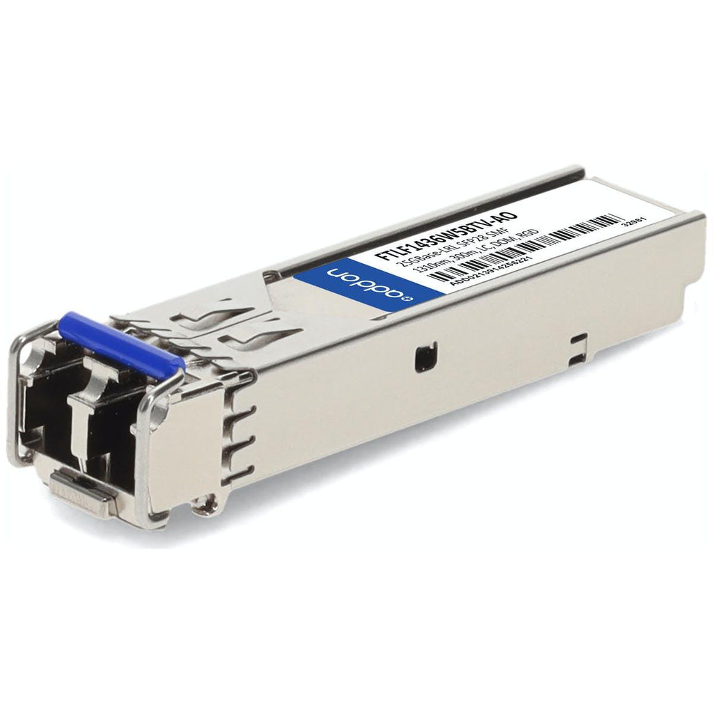 AddOn Networks FTLF1436W5BTV-AO. SFP transceiver type: Fiber optic, Maximum data transfer rate: 25000 Mbit/s, Interface type: SFP28. Certification: ISO, TAA, RoHS, CE, WEEE, NEBS, BBB. Number of products included: 1 pc(s)