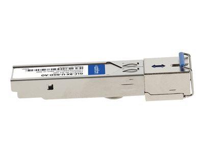 AddOn Networks GLC-BX-U-RGD-AO. SFP transceiver type: Fiber optic, Maximum data transfer rate: 1000 Mbit/s, Interface type: SFP. Country of origin: United States, Brand compatibility: Cisco, Certification: TAA. Width: 69.8 mm, Depth: 120.7 mm, Height: 30.5 mm. Package weight: 181.4368 g
