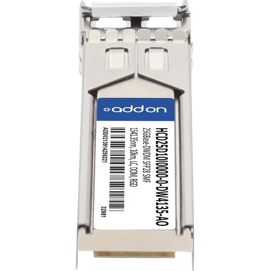 AddOn Networks HCD25D10I0000-0-DW4135-AO. SFP transceiver type: Fiber optic, Interface type: SFP28, Fiber optic connector: LC. Product colour: Silver. Number of products included: 1 pc(s). Shipping (inner) case net weight: 181 g