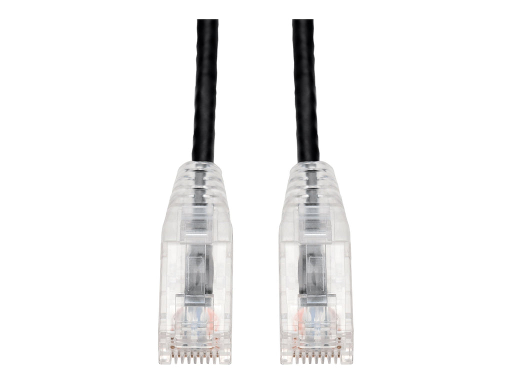 This is a 6in Black CAT 6 Slim PVC Ethernet Cable Snagless Clear-Claw RJ-45 M/M. CAT6 cables deliver ultra-fast internet speeds at up to 250 MHz, with a maximum speed of 10 Gbps (Gigabits per second) over shorter distances (up to 55 meters or 180 feet) and 1 Gbps over longer distances (up to 100 meters or 328 feet). They are ideal for high-performance home or office networks. UTP cables consist of pairs of insulated copper wires twisted together. Each pair is color-coded for easy identification. There is no additional shielding around the pairs, which makes these cables lightweight and flexible. The twisting helps to reduce electromagnetic interference (EMI) and crosstalk between pairs. PVC-CM is ideal for everyday home use, these cables offer reliable performance at an affordable price, perfect for connecting devices within a single floor. Our cables are PoE capable and TIA compliant, ensuring performance for all networking needs.