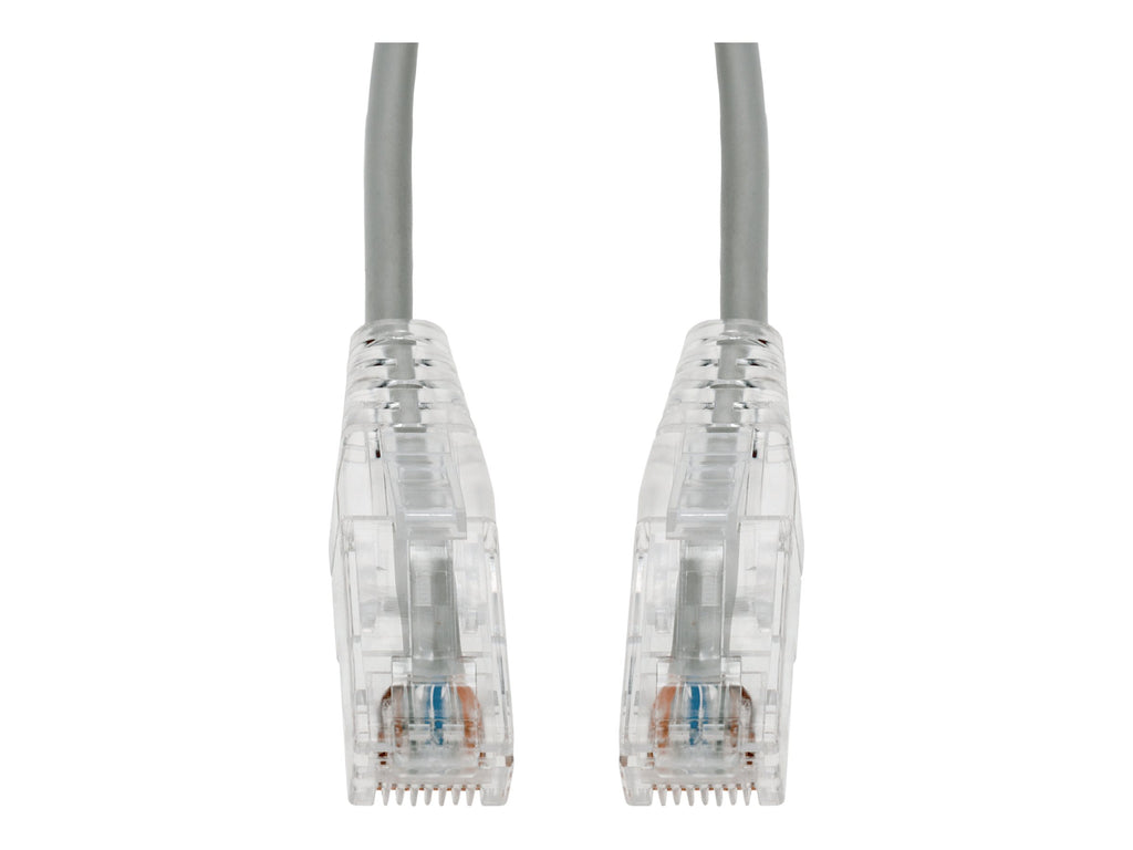 This is a 6in Gray CAT 6 Slim PVC Ethernet Cable Snagless Clear-Claw RJ-45 M/M. CAT6 cables deliver ultra-fast internet speeds at up to 250 MHz, with a maximum speed of 10 Gbps (Gigabits per second) over shorter distances (up to 55 meters or 180 feet) and 1 Gbps over longer distances (up to 100 meters or 328 feet). They are ideal for high-performance home or office networks. UTP cables consist of pairs of insulated copper wires twisted together. Each pair is color-coded for easy identification. There is no additional shielding around the pairs, which makes these cables lightweight and flexible. The twisting helps to reduce electromagnetic interference (EMI) and crosstalk between pairs. PVC-CM is ideal for everyday home use, these cables offer reliable performance at an affordable price, perfect for connecting devices within a single floor. Our cables are PoE capable and TIA compliant, ensuring performance for all networking needs.