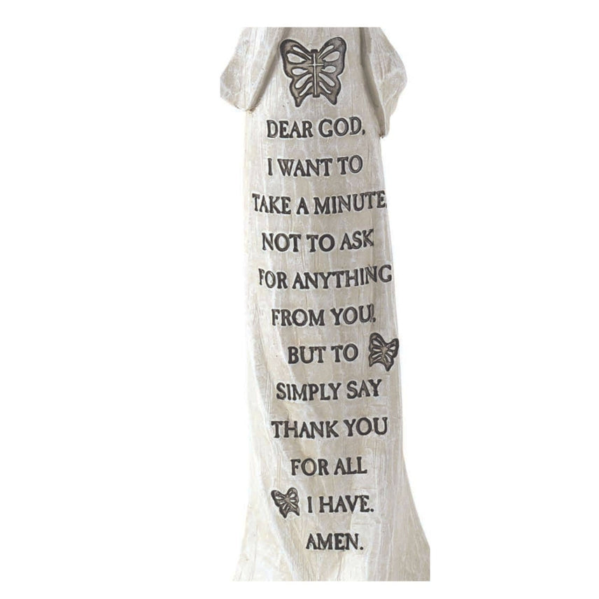 Embrace a moment of gratitude with the delightful Dear God Angel Figurine, a striking piece designed to inspire reflection and thankfulness. Standing at approximately 3.5 by 9 inches, this elegant resin angel features a charming white wood appearance that seamlessly fits into any decor style. Engraved with the heartfelt message: "Dear God, I want to take a minute not to ask for anything from you, but to simply say thank you for all I have. Amen," this figurine serves as a perfect reminder to pause and appreciate the blessings in our lives.