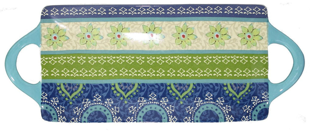 Anna Belle Rectangular Ceramic Serving Tray or simply an accent piece, measures 15.5" long x 6.25" Wide. A beautiful combination of blues and greens