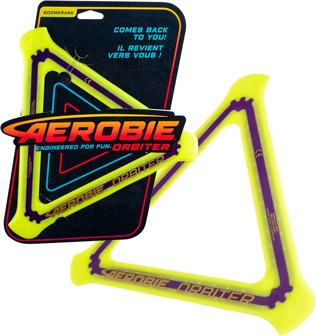 - AEROBIE ORBITER: This high performance boomerang flies out about 90 feet and really does come back; The triangular design and brightly colored soft rubber edge make it easy to see in flight and soft to catch