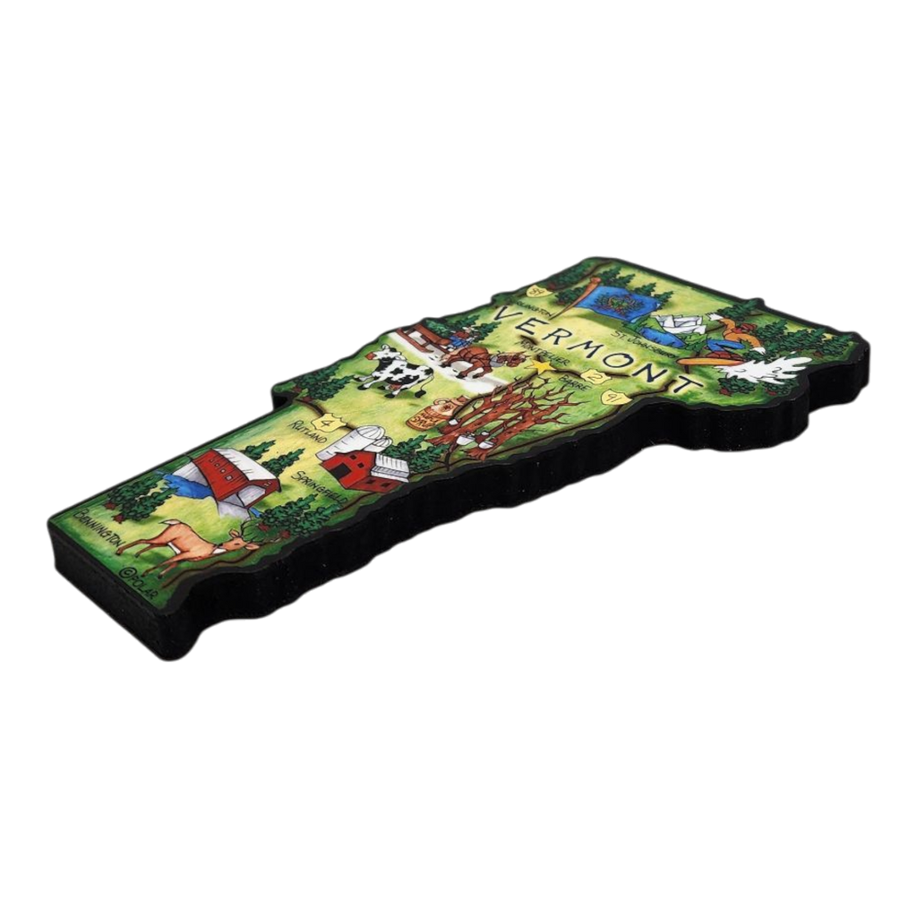 Embrace the beauty and charm of Vermont with this vibrant Artwood magnet, measuring 4.25 inches by 2.5 inches! Shaped like the state of Vermont, this delightful piece features an artistic representation of key landmarks and symbols that highlight the state's unique culture and scenic landscapes. With colorful illustrations of cows, deer, and iconic sites, this magnet beautifully captures the essence of the Green Mountain State.
