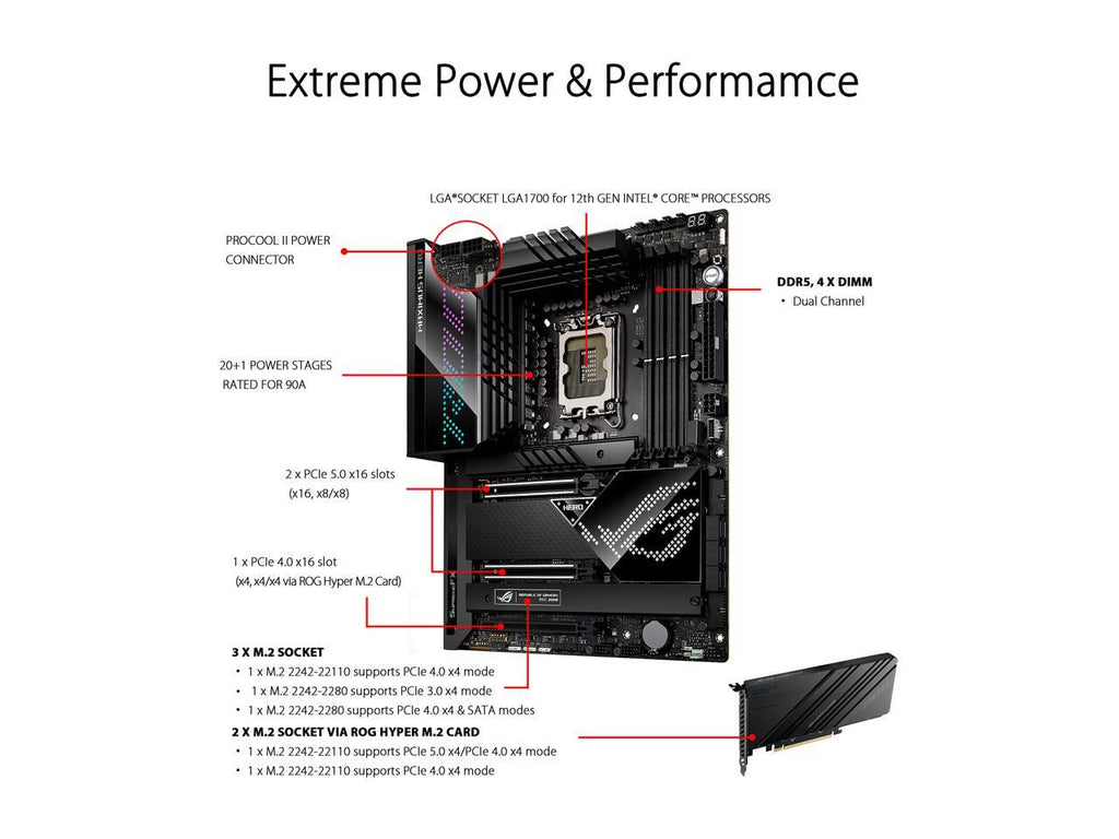 - Fastest Gaming Connectivity: PCIe 5.0, ROG Hyper M.2 card, USB 3.2 Gen 2x2 front-panel connector, 2 x Thunderbolt 4 (USB Type-C port)