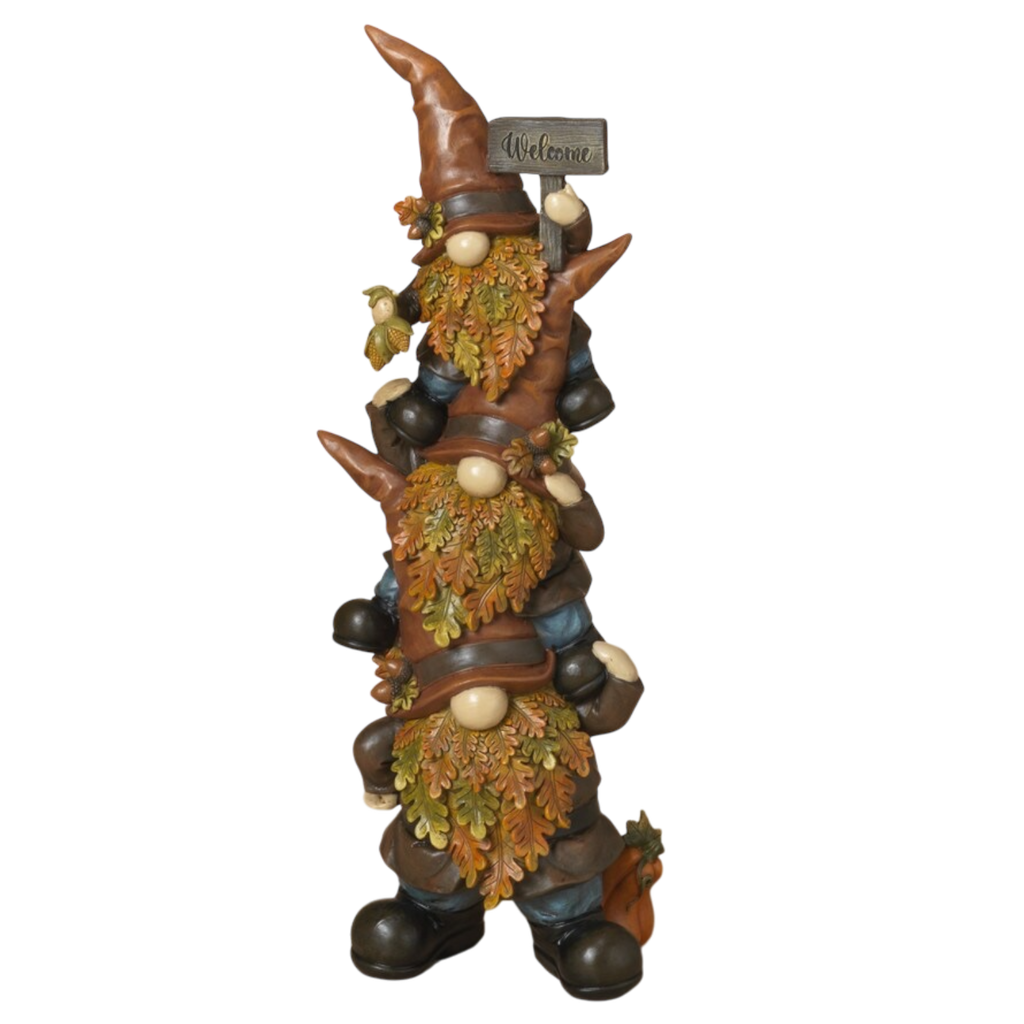 Spruce up your home this season with the delightful Autumn Gnome Welcome Stack, a charming decoration that brings a splash of whimsy to your autumn décor! Standing at 15.5 inches tall and 5 inches wide, this adorable resin gnome trio is adorned with colorful foliage, embodying the essence of the fall season. Each gnome features a distinct personality, complete with playful hats and a friendly expression, creating a warm and inviting atmosphere for all your visitors.