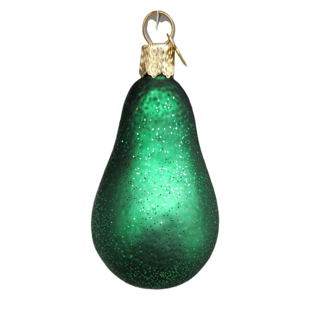 Legend has it that the first avocado was eaten by a Mayan Princess in Mexico around 300 B.C. It is also known as the alligator pear which describes the fruit's texture and pear shape. This beautiful glass ornament was carefully crafted for you to enjoy as a holiday decoration.
