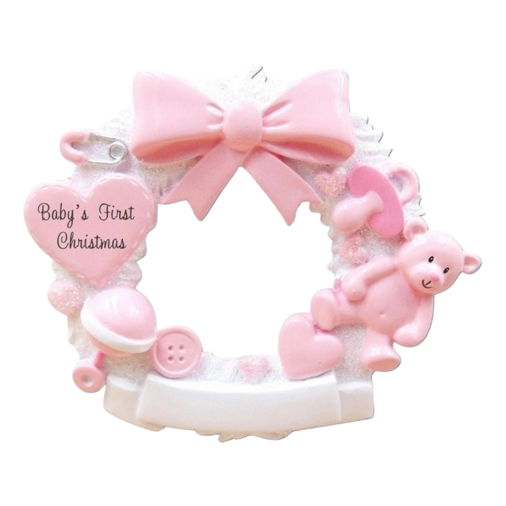 Celebrate your little one's very first Christmas with this adorable baby pink wreath ornament. Featuring charming details like a cuddly teddy bear, a pacifier, a rattle, and a large bow accentuated with sparkling touches, this ornament beautifully captures the joy and innocence of a baby's first holiday season. The heart-shaped charm proudly declares "Baby's First Christmas," making it a precious keepsake for years to come.