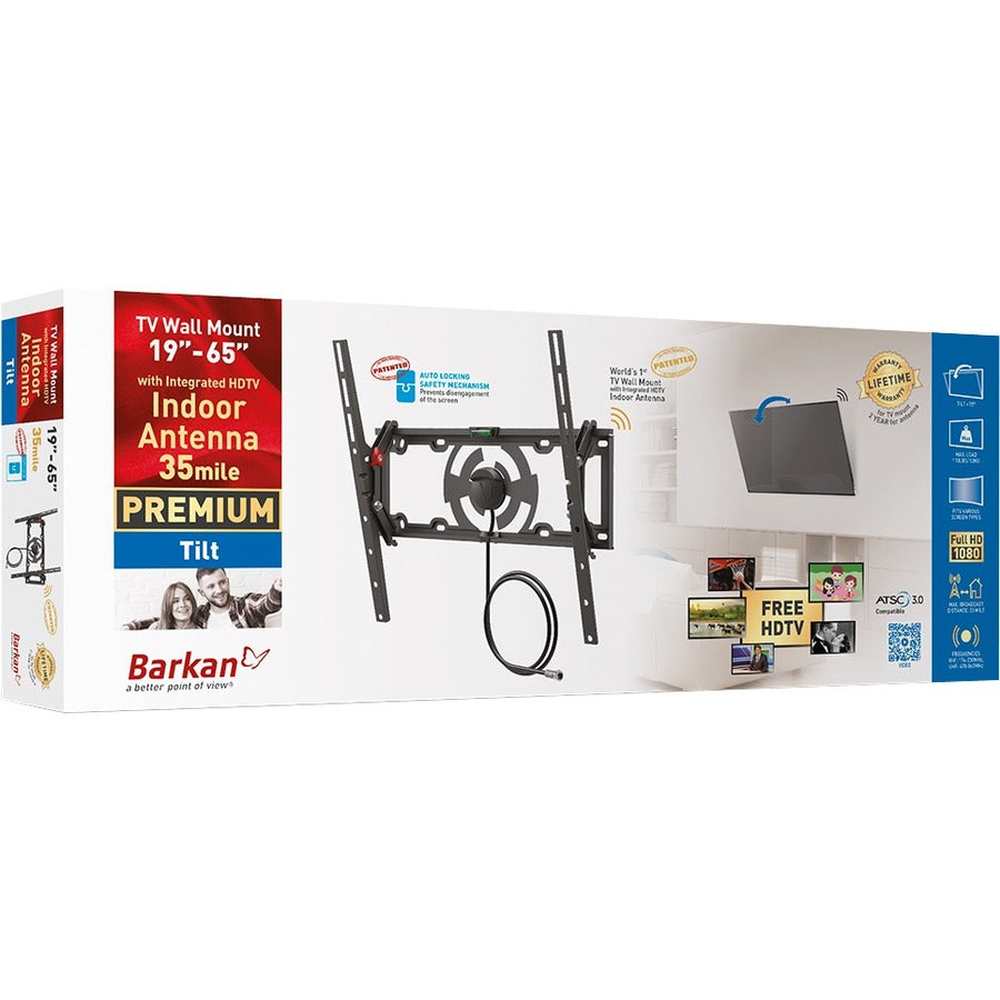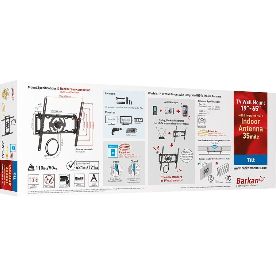 The Barkan tilt TV mount with integrated HDTV indoor antenna fits screens sizes 19 - 65 inches and weight up to 110lbs. Receives all free HDTV broadcast signals (ABC, CBS, NBC, Fox, The CW, PBS and more). The mount is suitable only for inner and outer walls built of drywall with wooden studs. The large mass of metal in the mount creates better reception for the HDTV antenna. The mount is patented in both the U.S. and China. It also features a patented auto-locking mechanism to prevent disengagement of the screen, with 2 hanging points in each side and without wires and moving parts that might break. It allows tool free tilt from 0 till 15 degrees. The distance from the wall is 2.6 inches. The built-in coaxial cable connects to a Smart TV or a decoder. The mount comes with a lifetime warranty, the integrated antenna comes with a 2 year warranty.