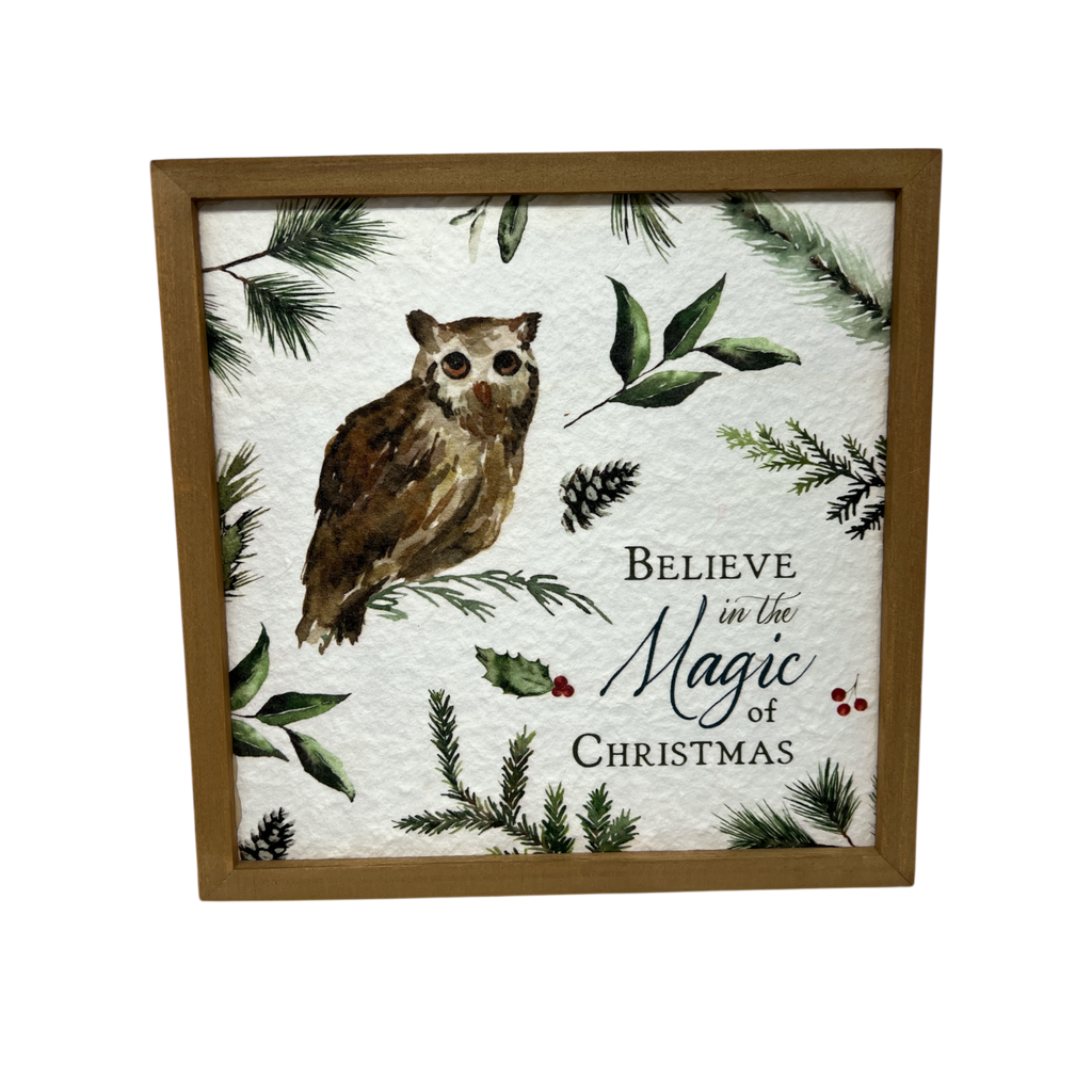 Infuse your home with a sense of wonder this holiday season using the enchanting Believe in the Magic of Christmas Wall Art! This beautifully textured print features a wise owl, surrounded by lush greenery and festive accents, all set against a soft backdrop that captures the serenity of winter. Measuring 7 inches by 7 inches, this delightful piece is framed in a natural wooden frame that adds a warm touch, with overall dimensions of approximately 7.75 inches by 7.75 inches.