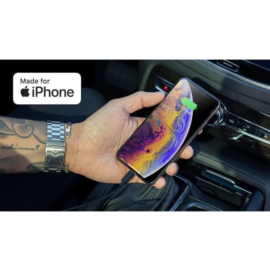 MFi-CERTIFIED CABLE The included USB-C cable with Lightning connector fast charges your iPhone or iPad straight out of the box for total convenience. Certified to the Made for iPhone standards set by Apple means it’s guaranteed to be compatible with all iOS devices. At 1.2m/4ft., the cable is long enough to reach hidden outlets in your car, but short enough to keep your dashboard free from clutter.