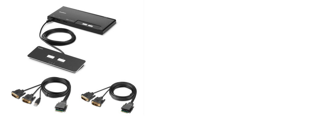 Belkin F1DN202MOD-DD-4. Keyboard port type: USB, Mouse port type: USB, Video port type: DVI-D. HD type: 4K Ultra HD, Maximum resolution: 3840 x 2160 pixels, Number of users: 1 user(s). Product colour: Black, Housing material: Aluminium, Cable length: 0.9 m. Power source: AC, AC input voltage: 100 - 240 V, Output voltage: 12 V. Cables included: DVI