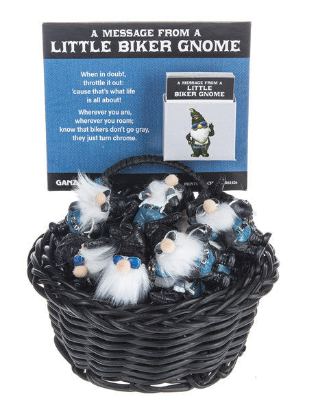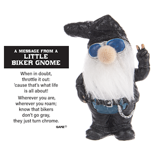 Accompanying the Biker Gnome is a whimsical sentiment card that reads: “When in doubt, throttle it out; ’cause that’s what life is all about! Wherever you are, wherever you roam; know that bikers don’t go gray, they just turn chrome.” This playful message captures the essence of living life to the fullest and embracing the adventures that come your way.