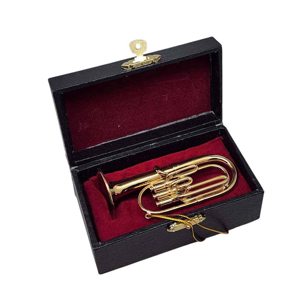 Celebrate the magic of the holidays with this charming brass euphonium ornament, a perfect gift for music lovers and band enthusiasts! This tiny, beautifully crafted euphonium captures the elegance of the real instrument with its shiny gold finish and detailed valves. Suspended from a gold string, this ornament adds a touch of musical cheer to any Christmas tree or festive display. Its compact size makes it a standout piece among traditional holiday decorations, bringing a unique melody to your seasonal décor.