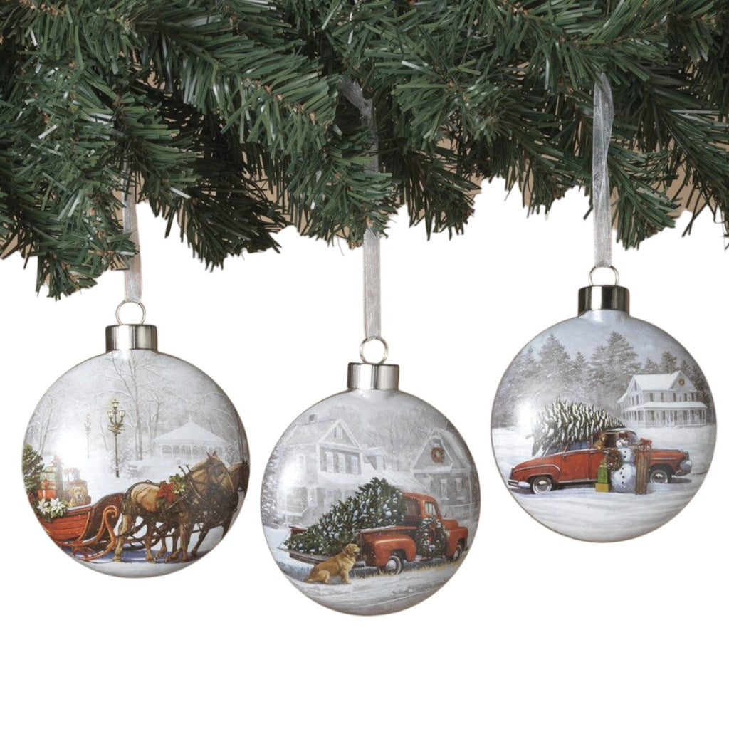Elevate your holiday décor with our beautifully crafted Vintage Winter Scene Ornaments, each featuring delightful designs and sold separately. These enchanting glass disc ornaments measure 4 inches in diameter and capture the essence of a picturesque winter, making them a perfect addition to your Christmas tree or seasonal display.