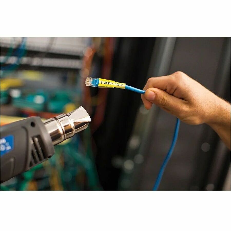 When the printed tube is placed over a cable and heated with a heat gun, the tube shrinks down, gripping the cable tightly. No adhesive is needed, ensuring that even in warm environments the heat shrink tube will not unpeel from the cable.