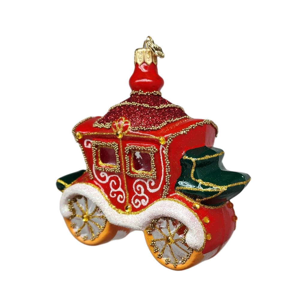 Step into a whimsical world of festive delight with the Buckingham Carriage glass ornament, designed by the renowned Christopher Radko. Standing at just about 4 inches tall, this vibrant ornament showcases a dazzling red and gold carriage, perfect for adding a touch of holiday magic to your Christmas tree. With intricate details that capture the essence of a fairy tale, this ornament invites you to dream of grand celebrations and joyous gatherings during the most wonderful time of the year.