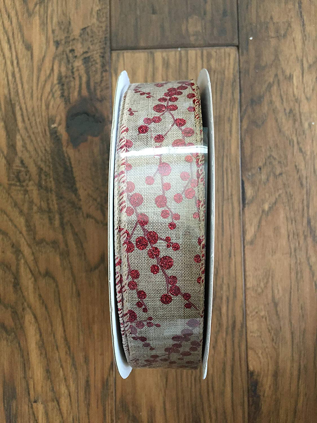 1.5 Inch wide Burlap ribbon with a festive Berry pattern.