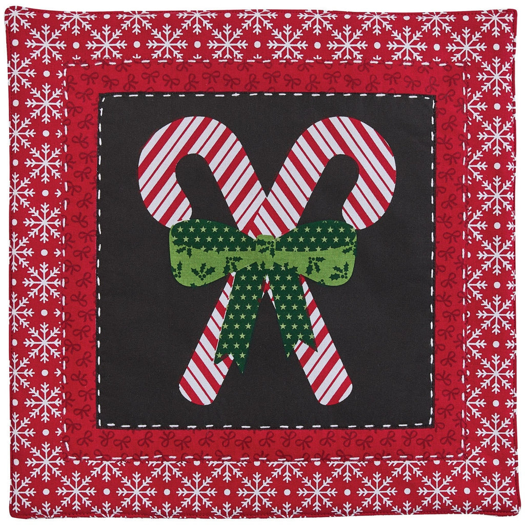 Add a festive touch to your holiday table with this charming 15" x 15" Christmas Candy Cane Placemat. Featuring a delightful design of two candy canes tied together with a green bow, this placemat is framed with a vibrant red border adorned with white snowflakes, creating an enchanting wintry scene. This placemat not only protects your table but also brings holiday cheer to every meal.