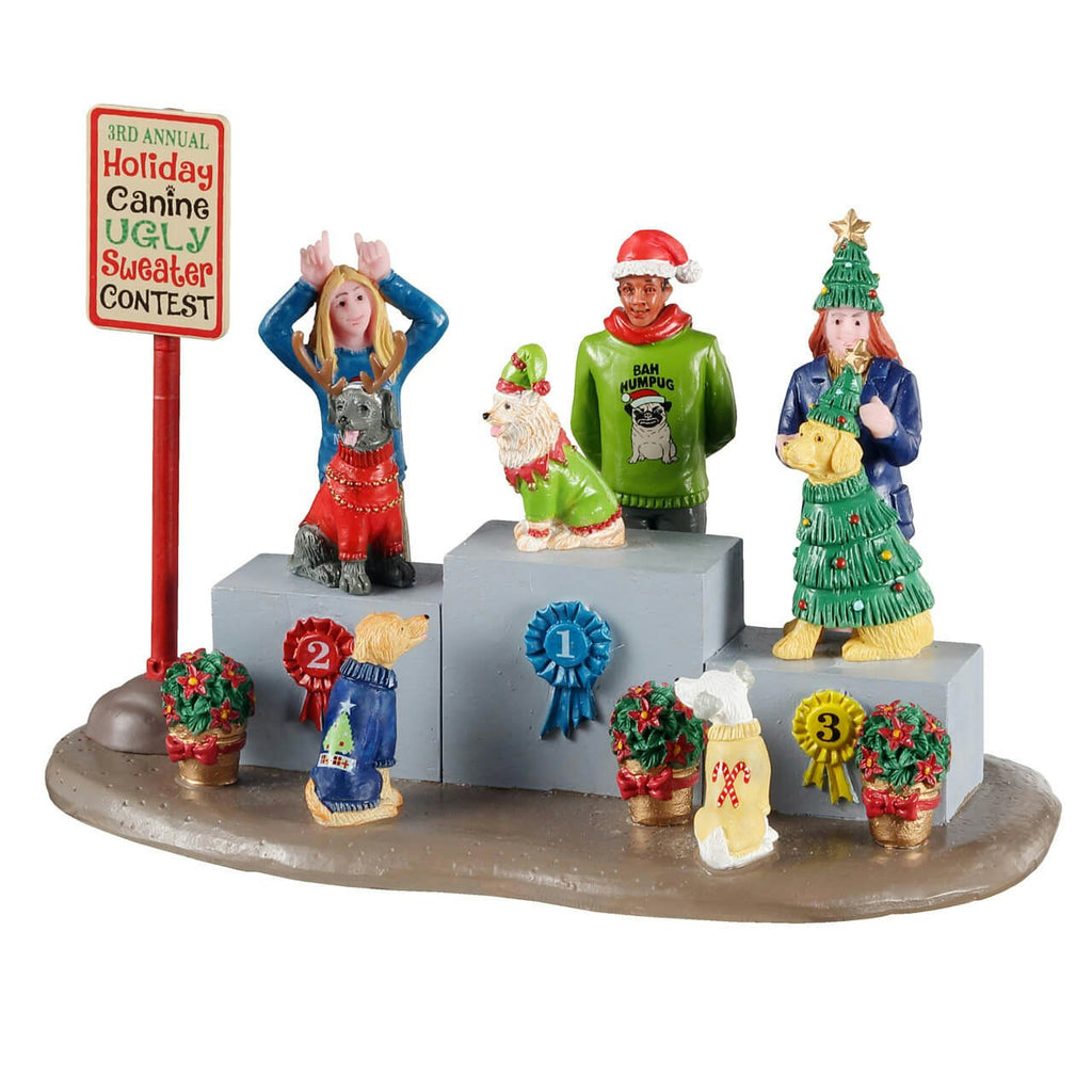 Join in the festive fun with the delightful Canine Holiday Sweater Contest, a charming centerpiece that captures the lighthearted spirit of the holidays! This whimsical scene features the third annual contest where pups show off their unique holiday sweaters, with winners proudly displayed on the podium. First place is claimed by an adorable dog dressed as an elf, while the runner-up sports a festive reindeer costume, and third place dazzles in a sparkling Christmas tree outfit. With colorful ribbons and cheerful participants, this scene promises to bring laughter and joy to your holiday village.