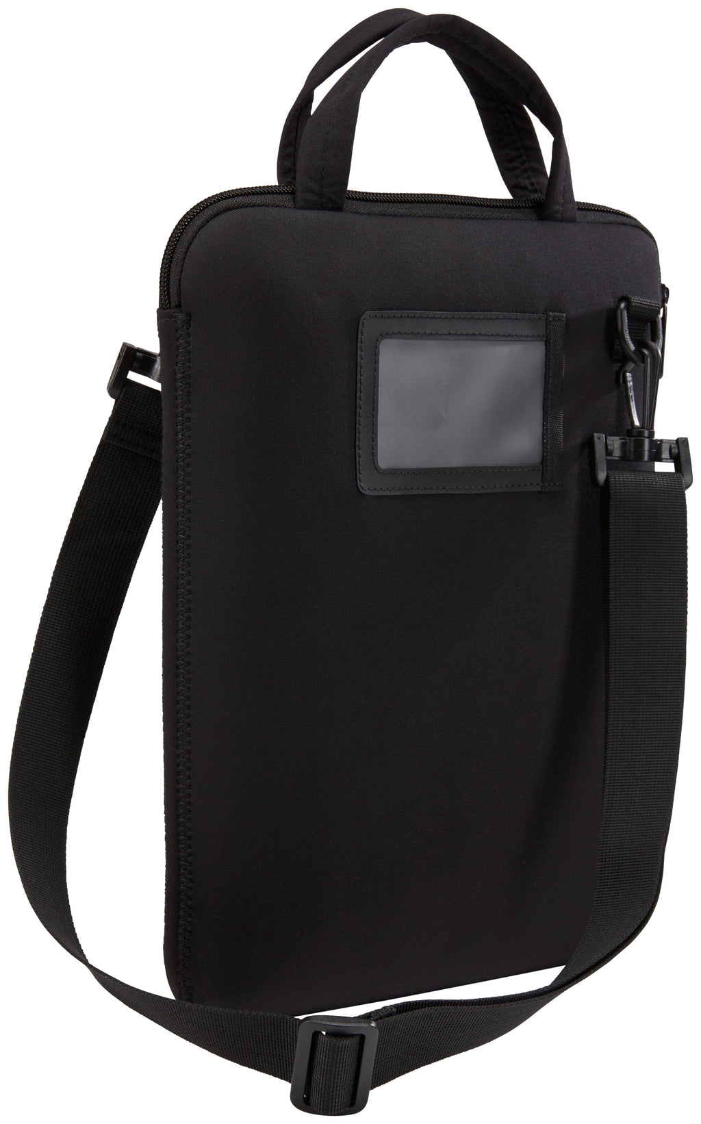 Vertical sleeve for 12" chromebooks™ with pocket for accessories and adjustable, removable shoulder strap.