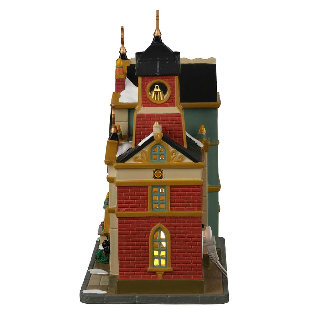 This LED lighted Lemax village building is a detailed miniature model of a cathedral, featuring vibrant stained glass windows, arched doorways, festive wreaths, and a bell tower topped with a cross. The structure is adorned with snow-topped roofs, adding a holiday touch to the scene. It is designed to be a charming addition to a Christmas village display.