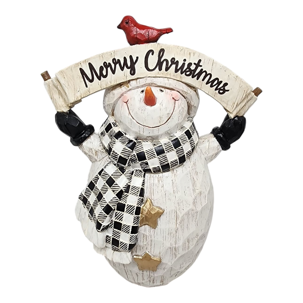 Browse the Complete Gifts & Holiday Collection Welcome the joy of the season into your home with our delightful Cheerful Snowman Figurines! Standing at an adorable 10 inches tall and crafted from durable resin, each snowman brings a smile and a sprinkle of holiday spirit to your decor. One charming figure is adorned with a festive "Merry Christmas" banner, complete with a bright red bird perched on top, while the other holds a cheerful "Tis the Season" sign, topped with a classic black hat and festive greenery.