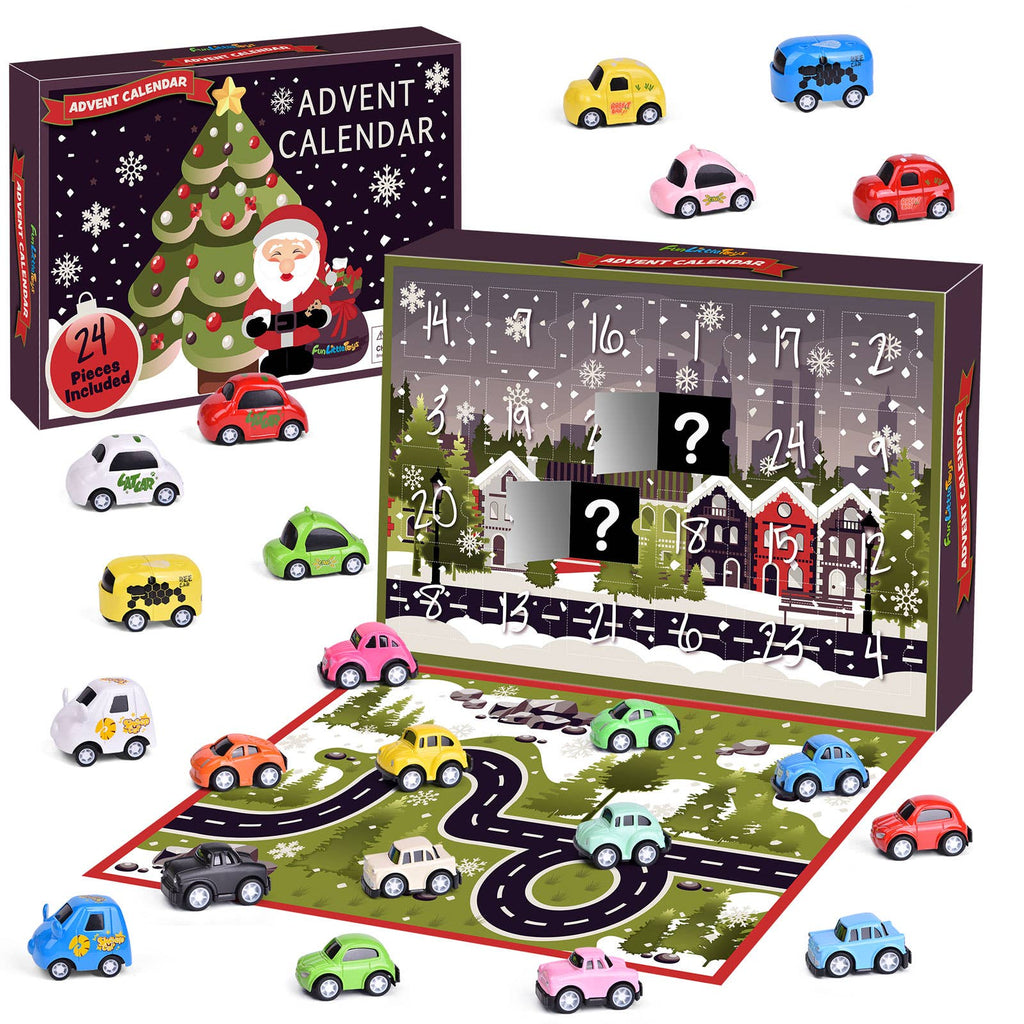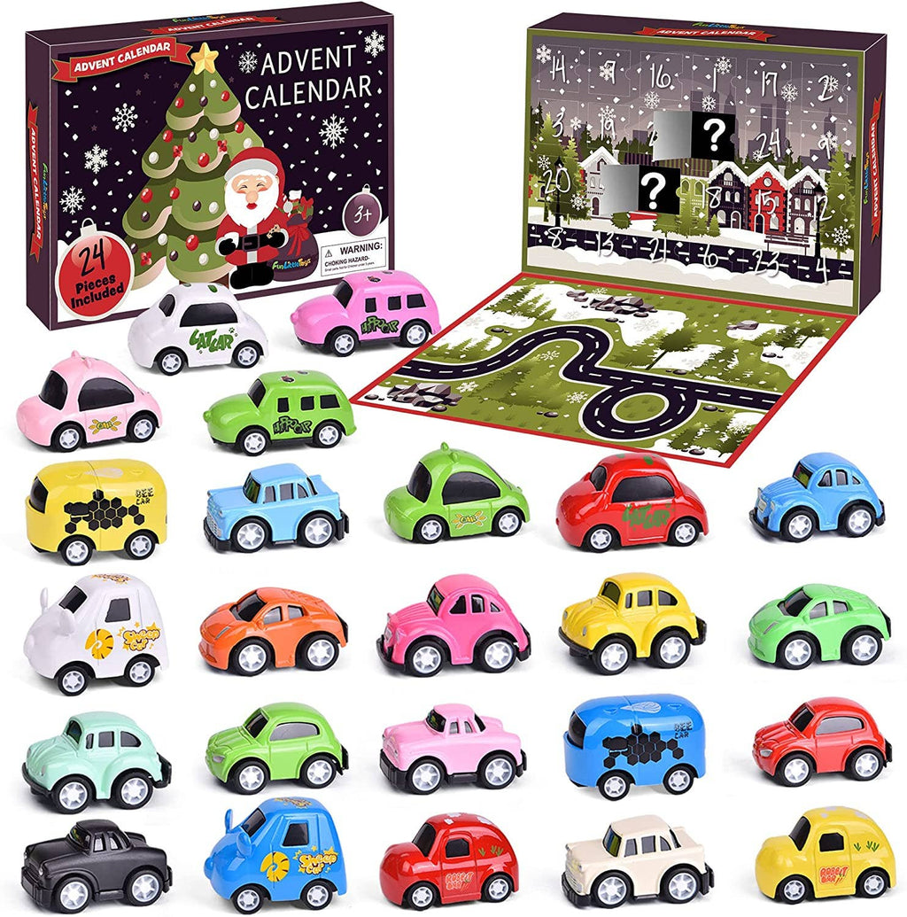The Fun Little Toys Advent Calendar: Car Collection features 1 Christmas Advent Calendar displaying a Jolly Santa Claus enjoying his favorite food in his North Pole home on the front. Flip it around and experience the main treat: a magical and mountainous winter wonderland with snow filling the sky, all behind 24 Cubbies packed with 24 Mini Cars!