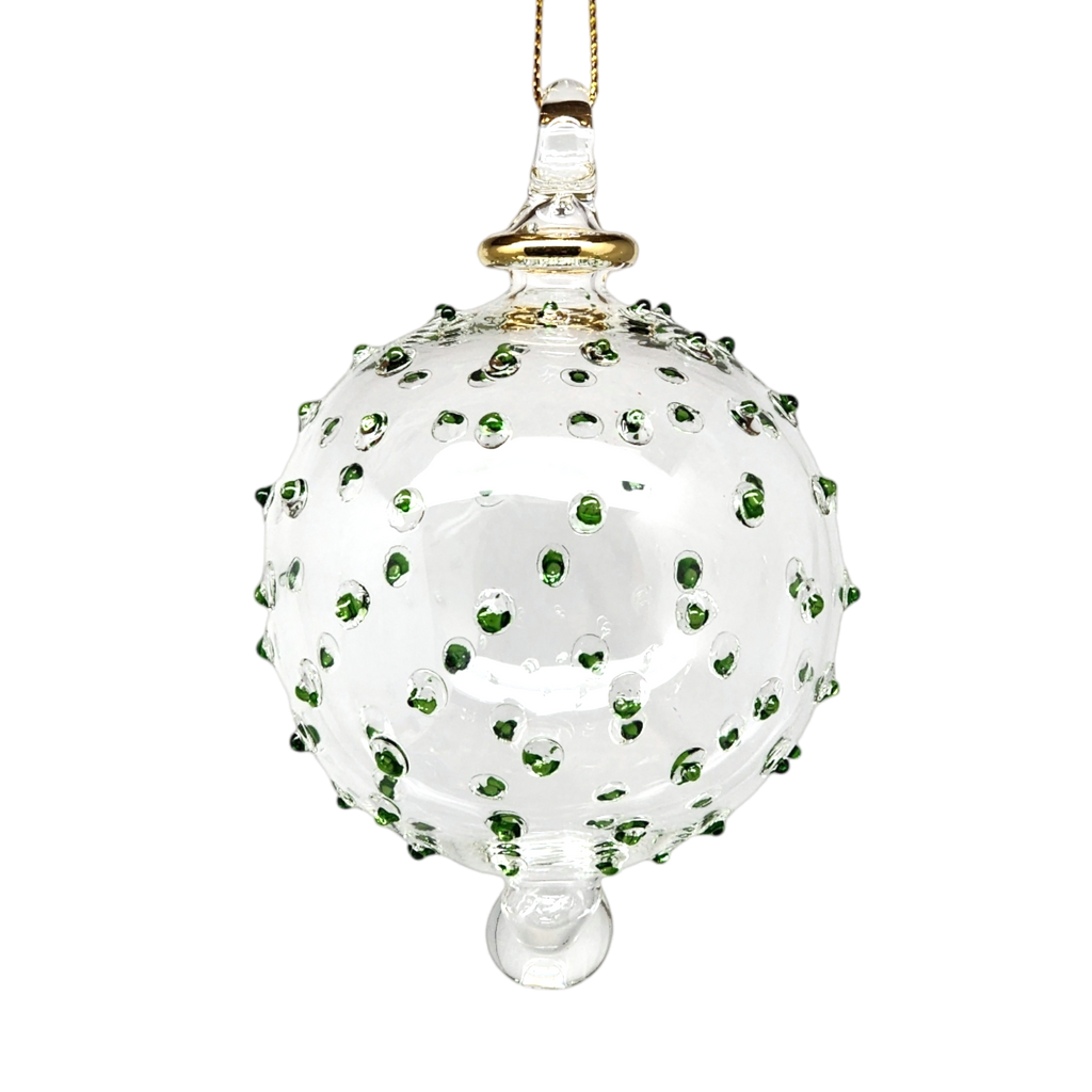Adorn your holiday decor with this delightful Clear Glass Stipple Ball in Green. This charming ornament is handcrafted using traditional glassblowing techniques that emphasize both artistry and precision. Each almost 3-inch sphere is embellished with striking green stipple dots, creating a playful yet sophisticated design that sparkles with festive cheer.