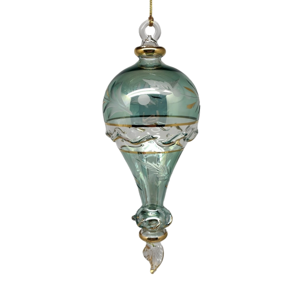 Step into a world of subtle elegance with this mouthblown glass ornament, expertly crafted in Egypt from durable German Pyrex glass. Bathed in a soft sage green hue and highlighted with delicate 24K gold accents, this piece exudes a peaceful and calming vibe perfect for the holiday season. Its engraved, hand-painted design is baked in a special oven to lock in the color’s brilliance, giving it a lasting glow that’ll shimmer gently on your Christmas tree.