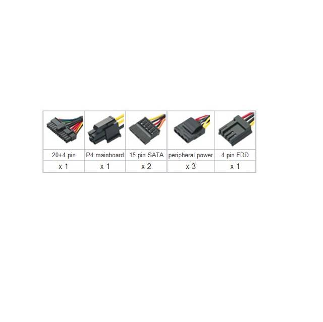 Connector: 1x 20+4pin Main Power Connector; 1x 4pin Mainboard Power Connector; 2x 15pin SATA Connectors; 3x Peripheral Connectors; 1x 4pin Floppy Connector