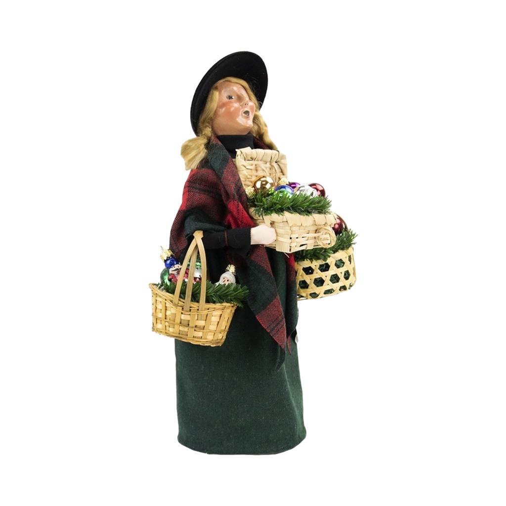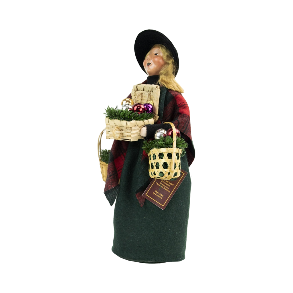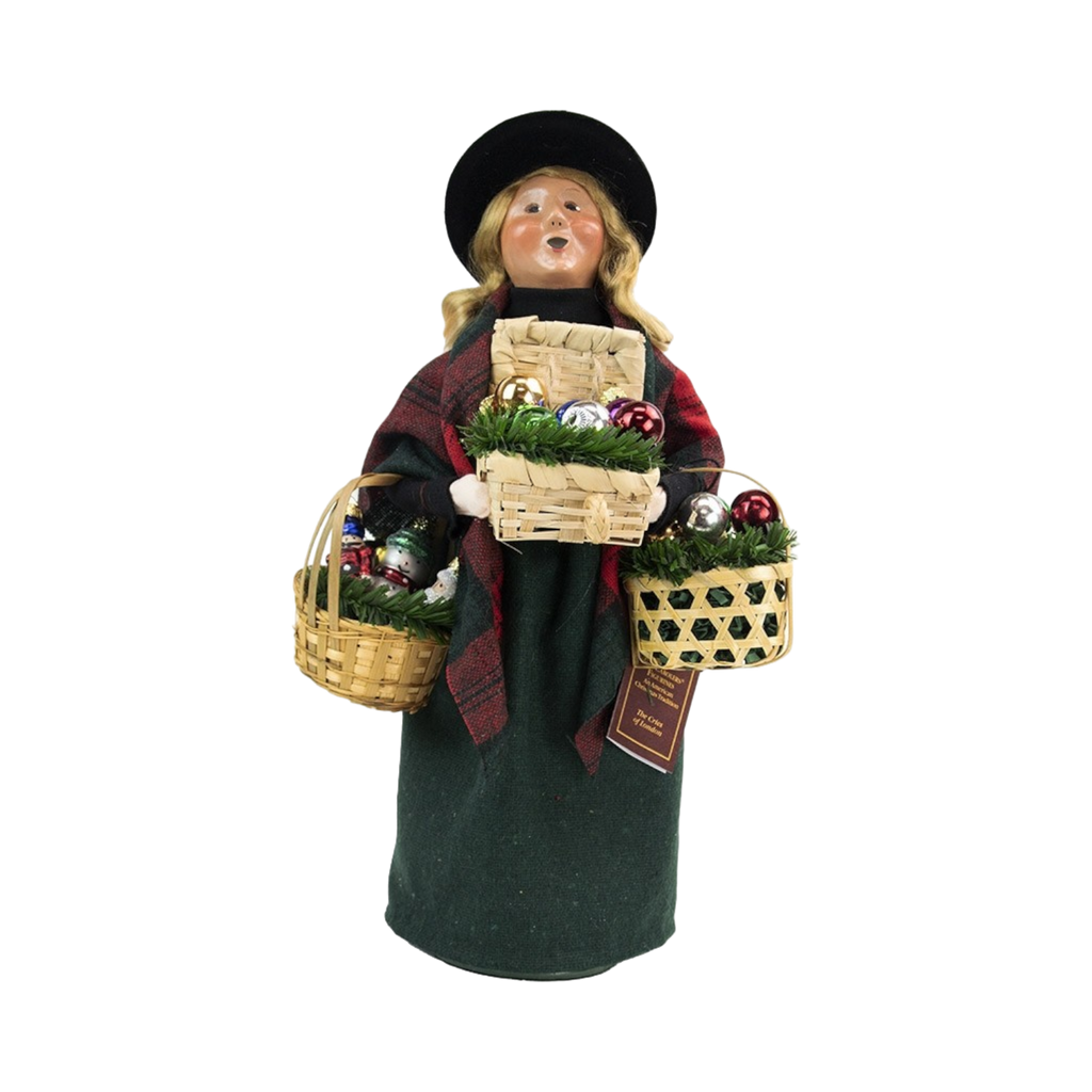 The Cries of London - The Cries of London collection embodies the street vendors of London known for the vocal selling of their wares. Also known as costermongers, these vendors sold everything from fresh fish and meat to produce. This years Cries of London series features a Cry Selling intricate and colorful ornaments. This Caroler is a part of the 2024 Byers Choice Cries Of London Collection.