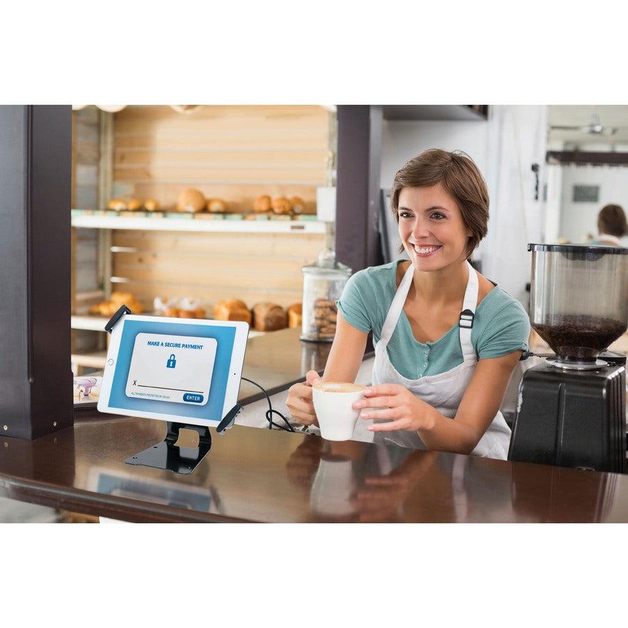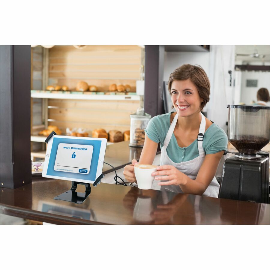 - Adjustable holder designed for iPad Pro, Surface Pro 4 and other large tablets - Lockable grip holder secured with the included cable lock and keys - Attachable metal stand with holes for secure countertop installation - Tilts to quickly flip from front to back of stand for easy transactions - Easily adjust viewing angle or rotate for horizontal or vertical views - Diagonal holder fits iPad (2nd-4th gen.), iPad Air 2 and most 9.7"–13" tablets - Strong security solution for office, retail, educational or commercial use - Holder includes VESA 75x75 compatible mounting holes