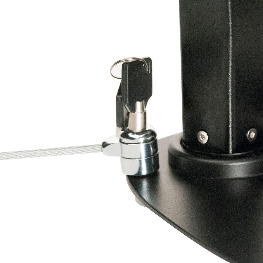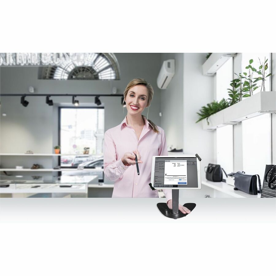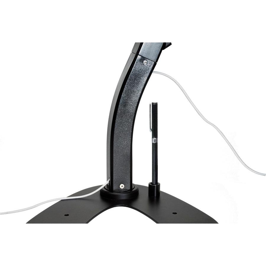 - Strong and stylish aluminum kiosk stand design - Adjustable holder fits iPad mini, iPad Air, iPad Pro, Galaxy Tab, Surface Pro, and most other 7 – 13 inch tablets - Key lock keeps tablet secured inside kiosk holder - Galvanized steel anti-theft cable locks kiosk to any permanent fixture - Easily adjust viewing angle or rotate for horizontal or vertical views - 360-degree rotating base for easy register and customer-side transactions - Mounting hardware included for secure desk or countertop installation - Hex socket flat head screws for added security - Includes all-in-one touchscreen stylus & ballpoint pen with built-in holder on base - Padded casing and base to protect tablet and furniture - Slots for charging cable to thread through the stand - Great for office, retail, restaurant, educational or commercial use - Large base and sturdy stand for stability