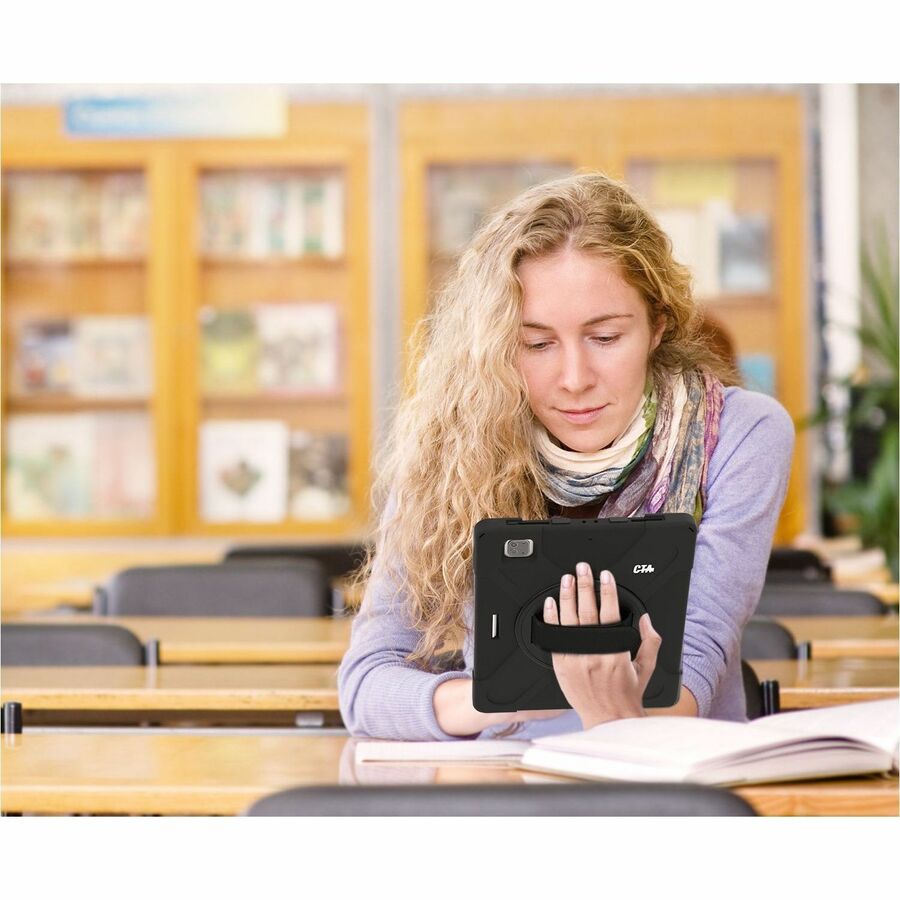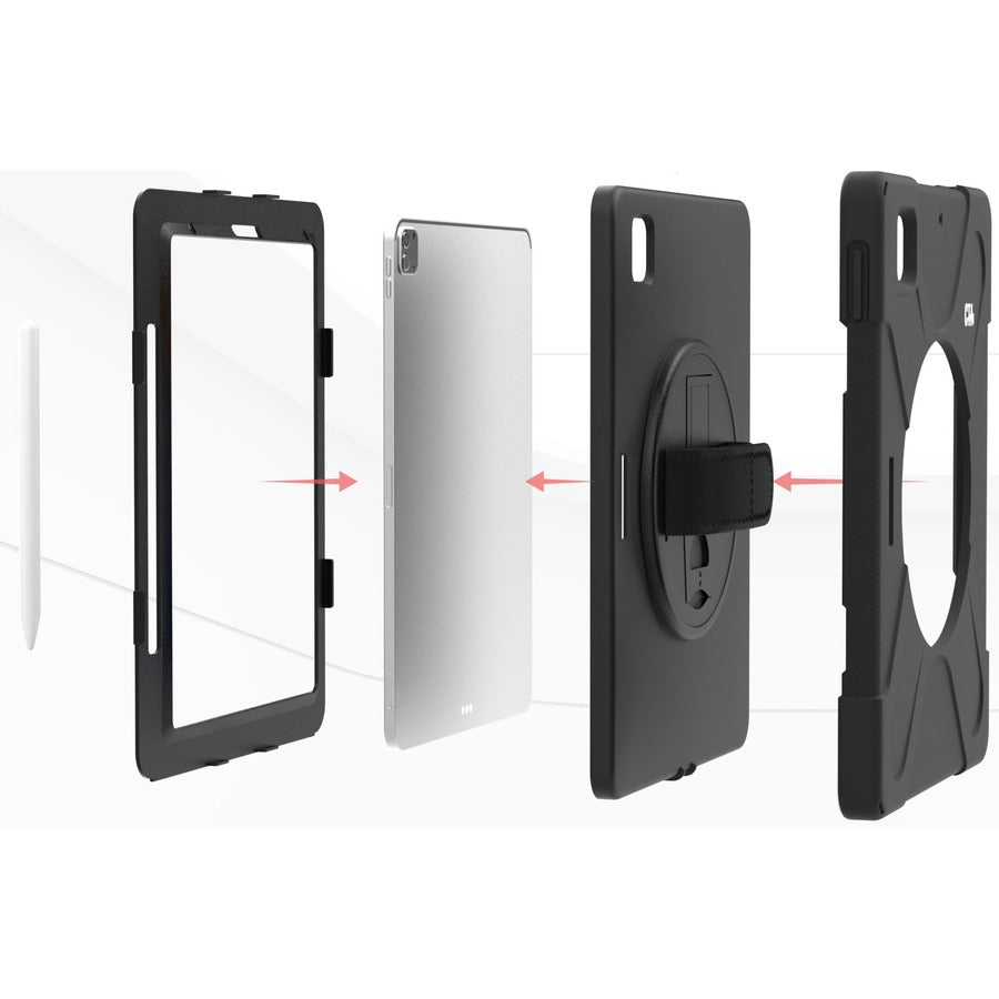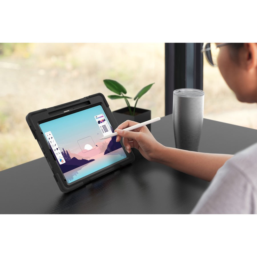 This protective tablet case keeps the iPad Pro 12.9-inch tablet shielded from collisions, bumps, and even dust. Its durable, rugged frame with reinforced corners provides heavy-duty impact shielding without compromising on usability. A silicone jacket offers further protection for your device. The case is designed to allow full access to your iPad's ports, buttons, and jacks, and features a dust-proof, splash-proof slots that add another layer of protection. This case has both a kickstand and adjustable hand strap that allows quick transitions between tabletop and handheld use in either portrait or landscape modes.