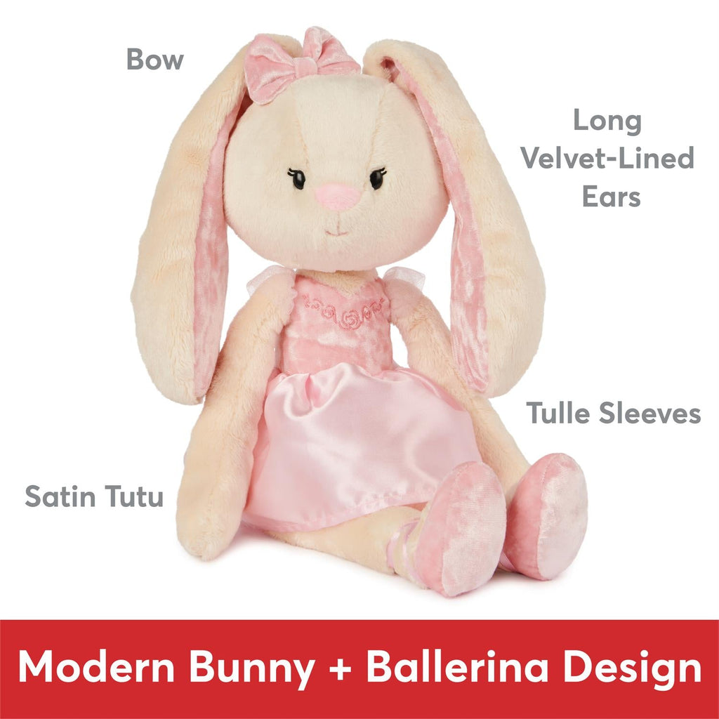 - BALLERINA BUNNY PLUSH: Curtsy is a 15` bunny rabbit with soft cream-colored plush, long ears, and a classic pink ballerina tutu with satin and tulle accents. Curtsy`s slender, posable frame and floppy limbs make her perfect for playtime anywhere!